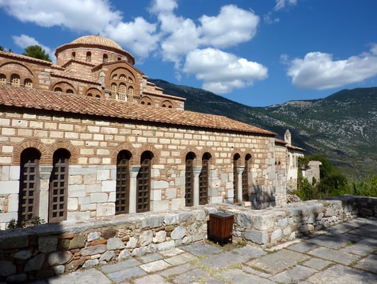Un arrêt dans un atelier d’artisanat d’art, assorti de quelques démonstrations et d’informations sur le travail de l’argile, la symbolique des décors, et nous quittons l’Argolide pour la Laconie, en passant par l’Arcadie au centre du Péloponnèse. Ici le paysage devient austère, une forêt basse et des broussailles couvrent les flancs de la montagne, peu de cultures ; l’émigration vers l’étranger a dépeuplé cette région, mais en retour les émigrés qui ont réussi construisent au pays et reviennent en vacances. Puis c’est la riche plaine de Laconie avec ses vergers d’oliviers, surtout des olives de table, et la traversée de Sparte, petite ville provinciale moderne, peu touristique. La cité rivale d’Athènes, fondée par des Doriens venus du nord du pays, réputée pour avoir eu la meilleure armée du monde antique, n’a pas laissé de traces spectaculaires de son passé. Devant nous, le mont Taygète, point culminant du Péloponnèse (2407 m) au pied duquel se trouve Mystra où, suite à une erreur de parcours, nous arrivons par une route de montagne offrant de superbes vues.