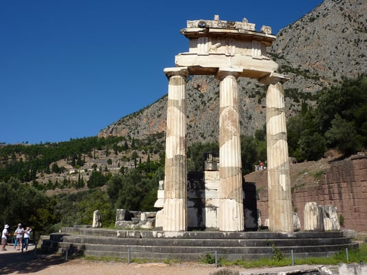 Puis, on descend pour visiter la zone de « la tholos de Marmaria ». Cet espace situé bien en contrebas du temple d’Apollon était à l’époque antique l’entrée du sanctuaire de Delphes. Plusieurs bâtiments y furent édifiés : le temple d’Athéna Pronaia en tuf, d’ordre dorique, dont deux colonnes sont encore dressées ainsi que les autels d’Athéna et de Zeus sur le mur desquels on déchiffre les noms d’Ilithyie, déesse des accouchements, et d’Hygie, déesse de la santé. Puis on aperçoit la célèbre tholos à péristyle construite par Théodoros de Phocée dont trois colonnes en marbre sont encore dressées dans ce décor exceptionnel.