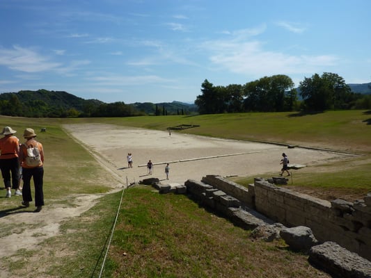 Entouré de collines, le site d’Olympie impressionne par son étendue : à perte de vue entre des bouquets d’arbres, quantité de colonnades réduites à leur base, des murs de fondation, des chaos de colonnes éboulées, quelques-unes redressées... Le parcours de ces ruines et les commentaires associés nous les rendent plus parlantes. Ce sont d’abord des bâtiments fonctionnels : les lieux d’entraînement des concurrents, le gymnase destiné aux athlètes, la palestre pour les lutteurs et les boxeurs ; des bâtiments réservés aux prêtres du sanctuaire de Zeus, non loin de l’atelier de Phidias – conçu aux dimensions du temple pour lequel le sculpteur réalisa une colossale statue chryséléphantine de Zeus sur un trône –, mais de l’atelier il ne reste que la base, les murs de briques visibles étant ceux d’une église paléo-chrétienne ; le Leonidaion (du nom du mécène), le seul hôtel du lieu, embelli à l’époque romaine. Presque au centre du site émergent l’imposant soubassement et des bases de colonnes (l’une récemment remontée) du temple de Zeus, de style dorique ; lien entre ce lieu sacré et le stade, le portique d’Echo où étaient proclamés les vainqueurs. Le stade, auquel les spectateurs – des hommes seulement, sauf la déesse Déméter – accédaient par un passage voûté, réduit aujourd’hui à un élément, représente pour les visiteurs du XXIe s. le lieu emblématique d’Olympie : un rectangle de terre battue de 192 mètres de long entre les deux lignes de dalles de marbre marquant le départ ou l’arrivée, bordé de talus en pente douce sans gradins, sauf ceux des juges. Ce lieu nous avait lui aussi laissé des souvenirs. D’autres vestiges le long du chemin menant au temple d’Héra, le plus ancien, autre endroit sacré où aurait été conservé le texte de la trêve olympique, tandis que depuis 1936 c’est sur l’autel d’Héra situé devant lui qu’est allumée la flamme olympique. Signalons encore Le Philippéion, tholos aux colonnes ioniques offerte par Philippe II, mais il est impossible de tout évoquer…